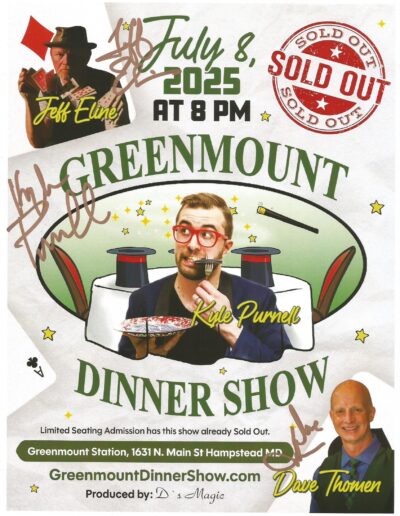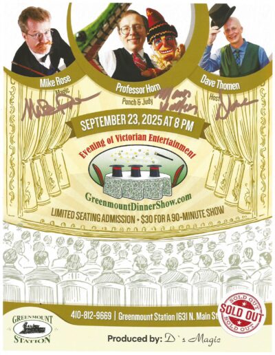 The Tuesday Greenmount Station Dinner Show in a 30 seat theater room features different guest entertainers with Dave every other month. The Hampstead restaurant is located in Carroll County, 10 minutes east of Westminster, and the shows are produced by D’s Magic. Below are the posters showcasing the top talent that entertains at Greenmount Station. The Society of American Magicians volunteer so that ticket sales can be paid to the best acts. Limited seating admission is $30 each for a 90-minute show. Fee is for show only and does not include food or drinks. Guests dine from the menu prior to the show.
