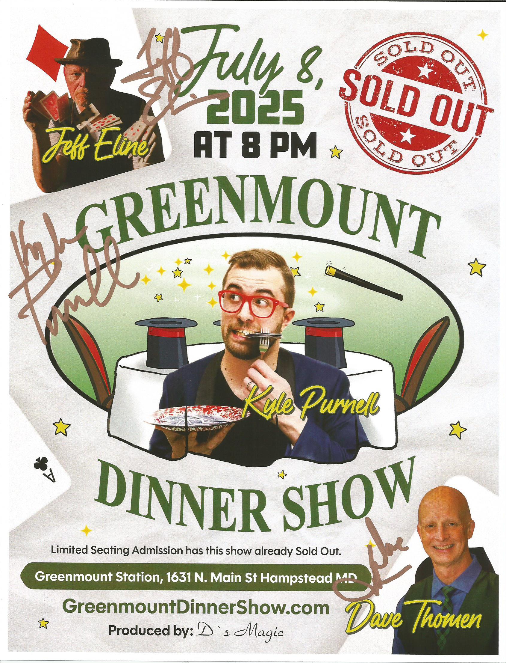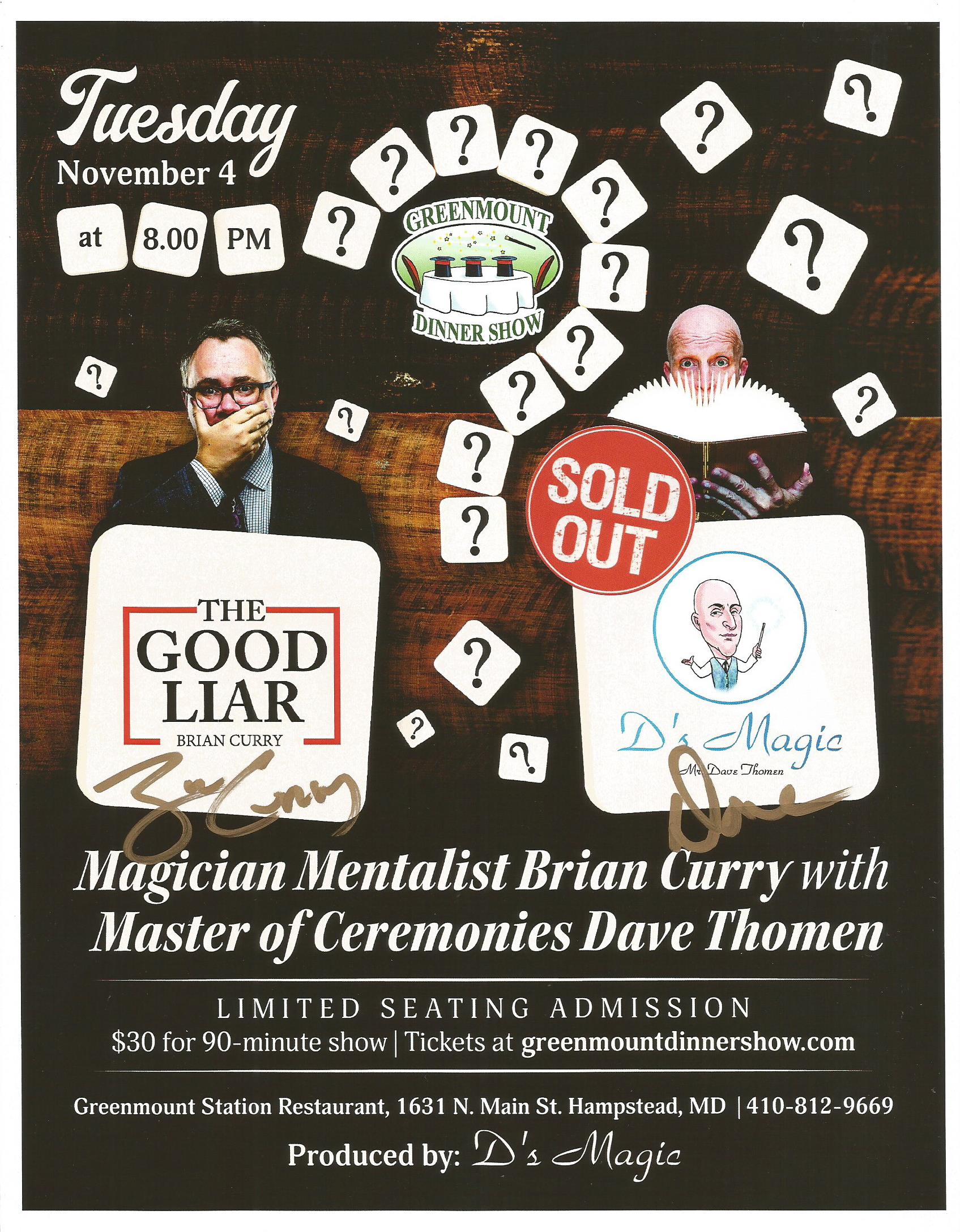 The Tuesday Greenmount Station Dinner Show in a 30 seat theater room features different guest entertainers with Dave every other month. The Hampstead restaurant is located in Carroll County, 10 minutes east of Westminster, and the shows are produced by D’s Magic. Below are the posters showcasing the top talent that entertains at Greenmount Station. The Society of American Magicians volunteer so that ticket sales can be paid to the best acts. Limited seating admission is $30 each for a 90-minute show. Fee is for show only and does not include food or drinks. Guests dine from the menu prior to the show.