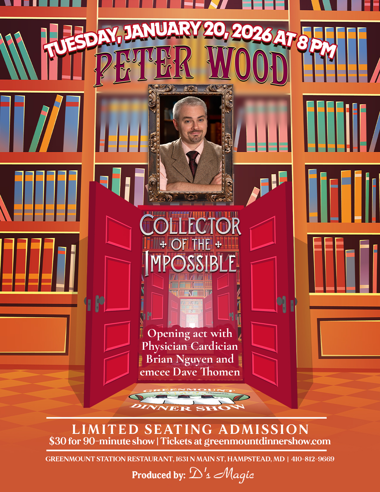 Use this ticket link to order for our next show, January 20, 2026 at 8 PM starring Peter Wood, Collector of the Impossible. His performance blends astonishing artifacts, humor, and audience interaction plus Peter was featured twice on Penn & Teller: Fool Us! Described by Baltimore Magazine as “charming, witty, and amazing,” Peter is a frequent performer for major companies like Amazon, Microsoft, and Under Armour and a feature at Washington, D.C.’s International Spy Museum. Opening is the “Magician M.D.” Dr. Brian Nguyen, a physician who blends the precision of medical science with card artistry to deliver unforgettable moments of wonder! Master of Ceremonies Dave Thomen adds to the excitement with surprises, laughs, and door prizes, promising a night of fun!