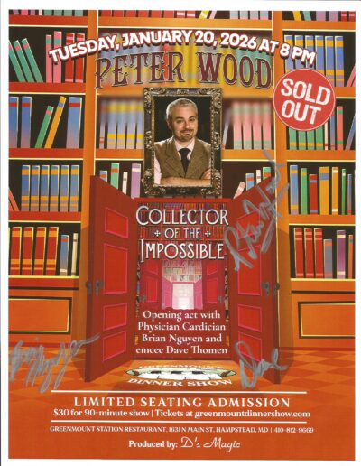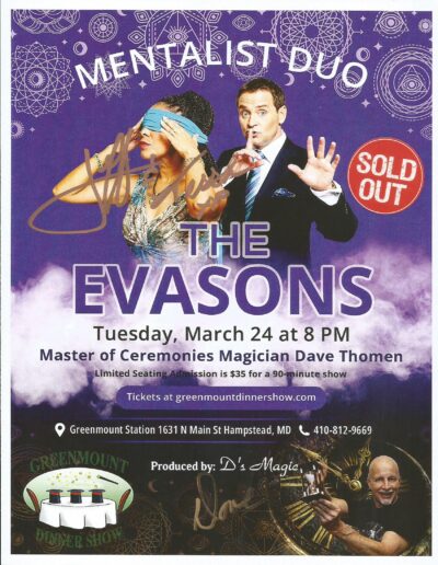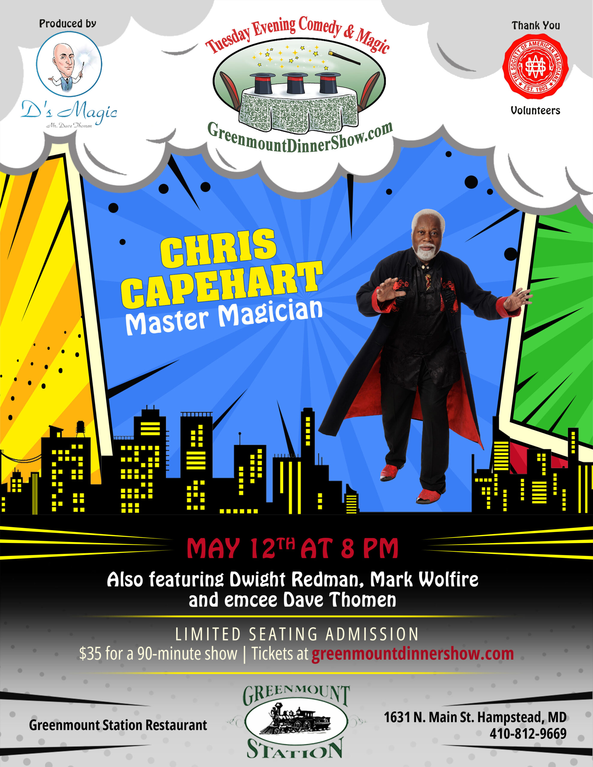 The Tuesday Greenmount Station Dinner Show, held in a cozy 30-seat theater, brings in different guest entertainers to perform with Dave every other month. Located in Hampstead, just 10 minutes east of Westminster, the restaurant hosts shows produced by D’s Magic. Posters highlight the top talent featured at Greenmount Station, and the Society of American Magicians volunteers so ticket sales can go directly to securing the best acts. Admission is $35 per person for a 90-minute show, covering the performance only—food and drinks are extra. Guests enjoy dining from the menu before the show, and tickets should be purchased quickly, as most shows sell out shortly after being announced.
